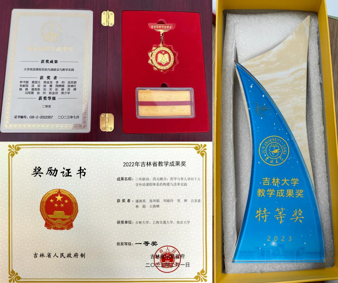 近年来,学院教学成果奖实现了历史性突破,学校大学外语校本改革获吉林省教育教学成果一等奖;与华南理工大学共同申报的项目获得国家级教学成果奖二等奖;此外学院获校级教学成果奖特等奖1项,其他奖项7项。