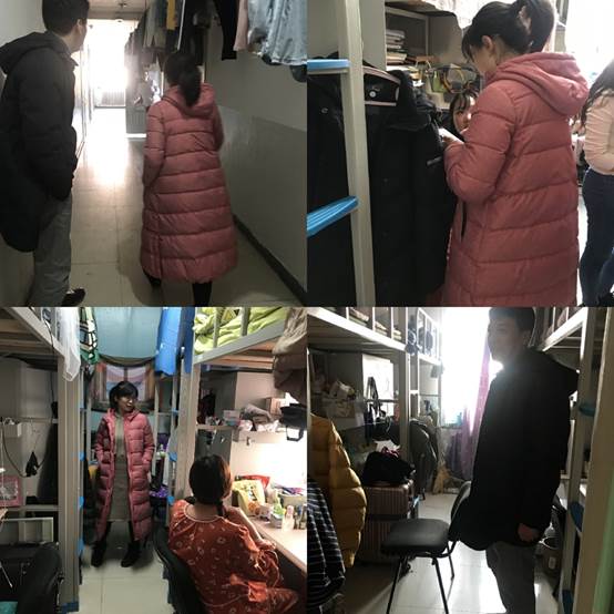 本次检查重点针对宿舍消防安全和卫生环境。在检查中,梅院长和曾老师对宿舍是否存在违规使用大功率电器和卫生情况等问题进行详细检查。从检查结果看,学生宿舍符合安全用电规范、卫生情况良好。老师们表扬了部分宿舍,对同学们的不足之处提出相应的改进措施。然后,梅院长和曾老师亲切地就如何创建文明宿舍与学生进行交谈,仔细地了解同学们在寝室的学习、生活状况,关切地询问同学们复习计划和当前进展。同学们也积极思考如何创建文明宿舍并提出自己的想法,现场气氛十分和谐融洽。最后,梅院长和曾老师还叮嘱同学们:“温度变化大,出行注意保暖!”