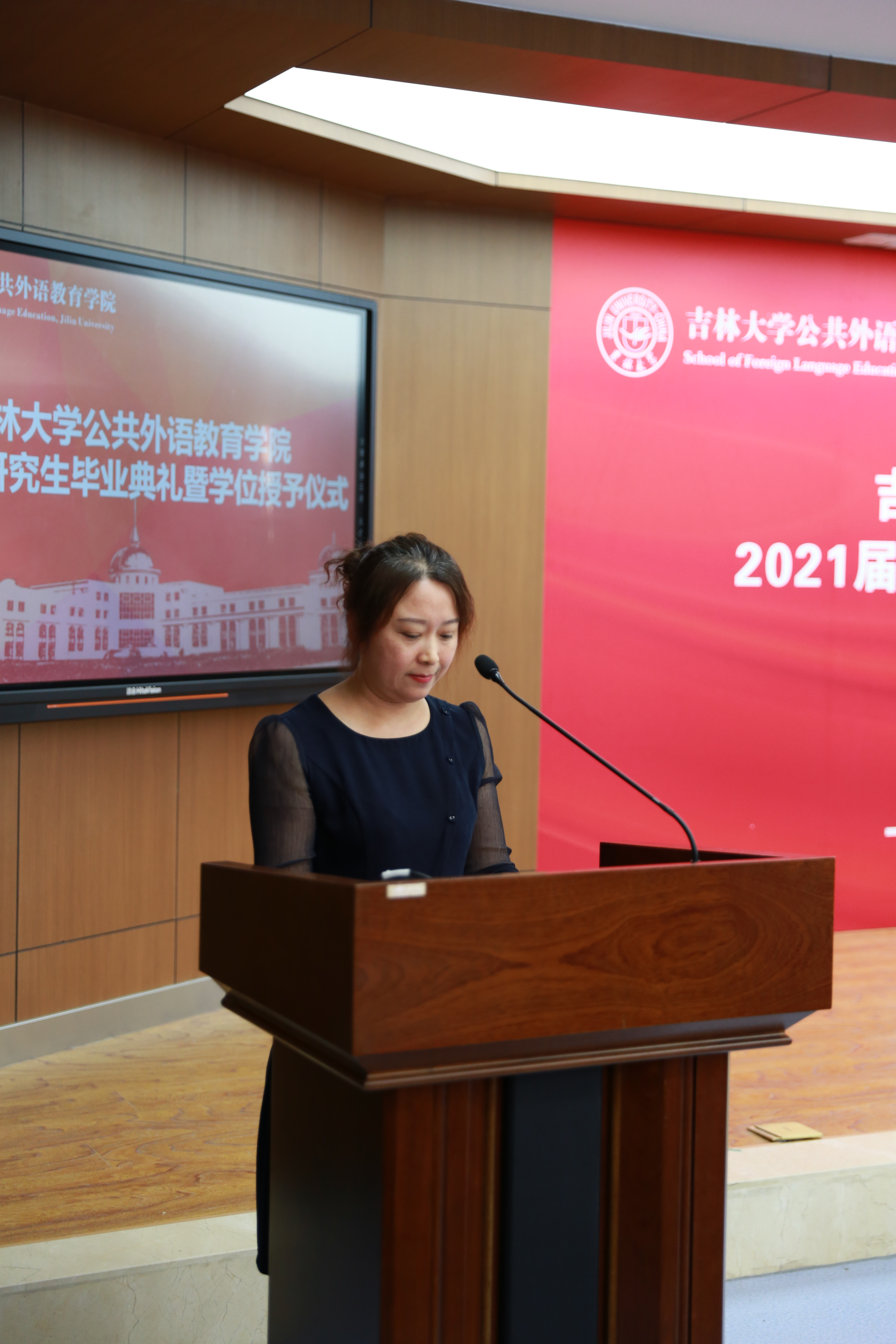 2021届毕业生王玲代表全体毕业生发言。她回顾了在吉林大学三年的学习生活,深切地表达了对同学们、老师们和学院的感激和祝愿,以及在今后的工作岗位上继续践行“人比山高,脚比路长”吉大精神的坚定决心。