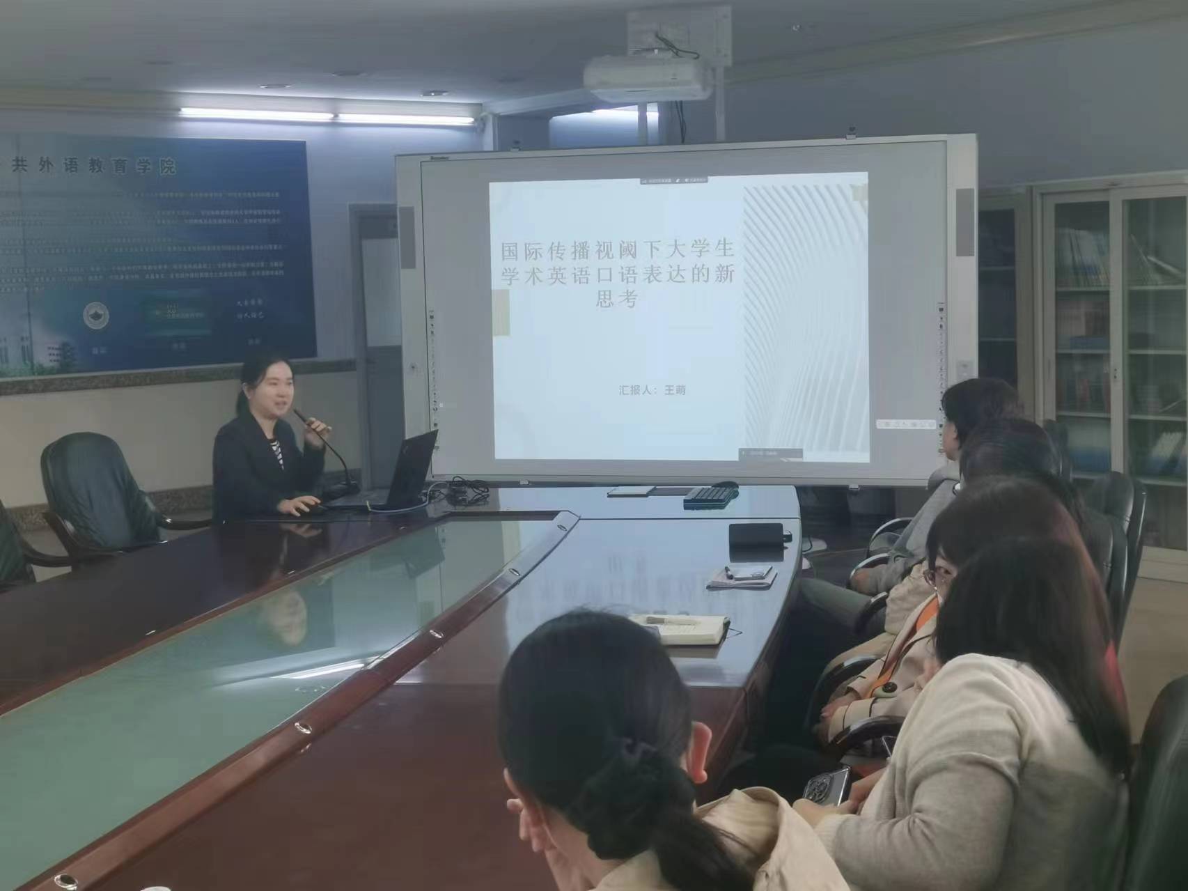 王萌老师以“国际传播视阈下大学生学术英语口语表达的新思考”为题,探讨了外语教育转向背景下以国际传播能力建设为目标培养学生用英语讲述中国故事的重要性。她认为在学术话语传播的过程中合理运用语言及非语言表达手段能够增强学生的叙事能力及有备演讲的表达能力。王萌老师分析了当下大学生在学术口语汇报中出现的问题,针对教学的不足之处提出了若干改进方法并在课堂中加以实践。