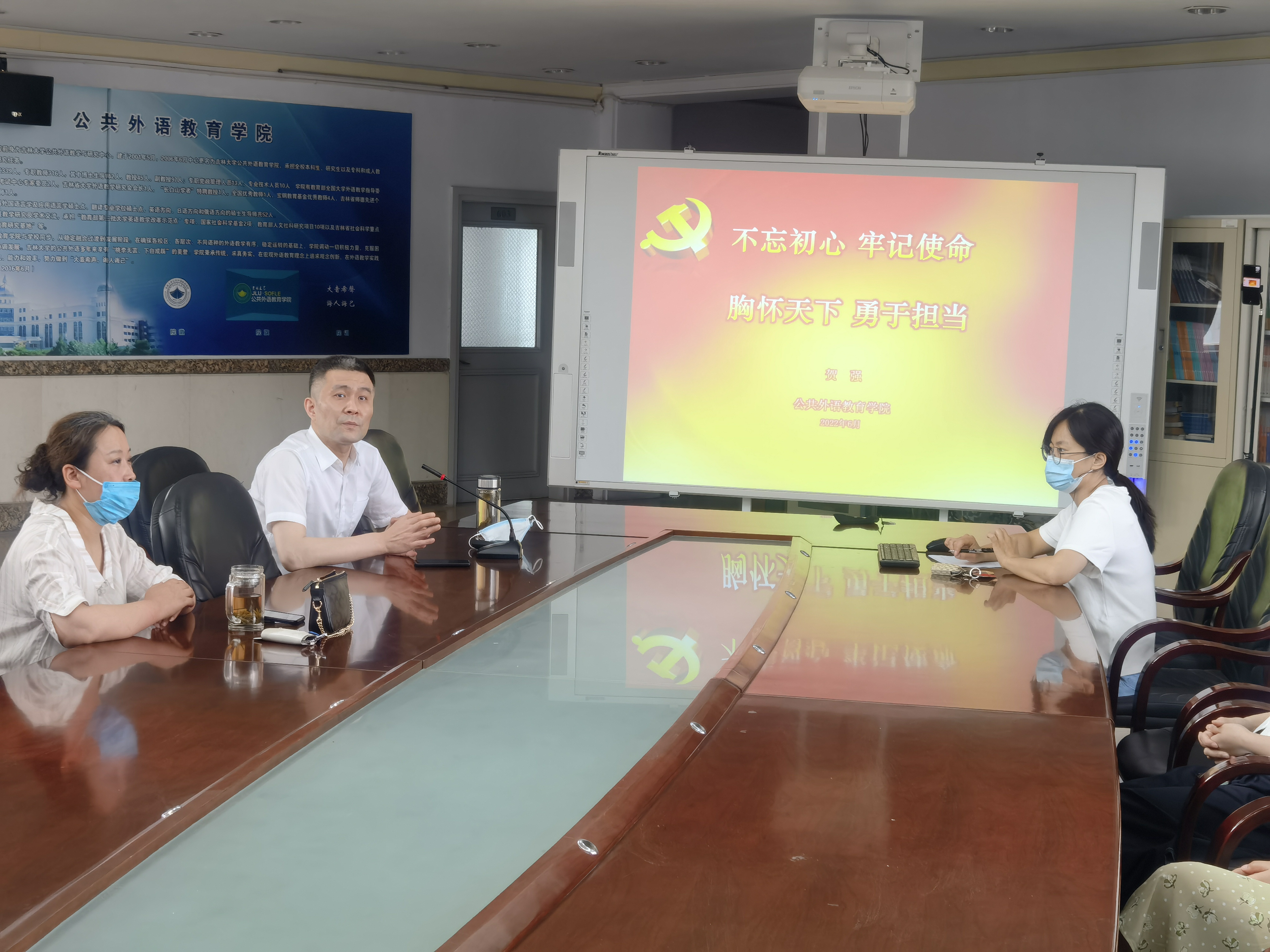 2022年6月17日上午9时,公共外语教育学院党委书记贺强在外语楼六楼会议报告厅为我院2022届研究生毕业生党员上了一堂以“不忘初心,牢记使命,胸怀天下,勇于担当”为主题的党课。此次党课由辅导员曾媛主持,党委副书记徐杰老师列席。全体毕业生党员通过线上线下相结合方式参加此次活动。