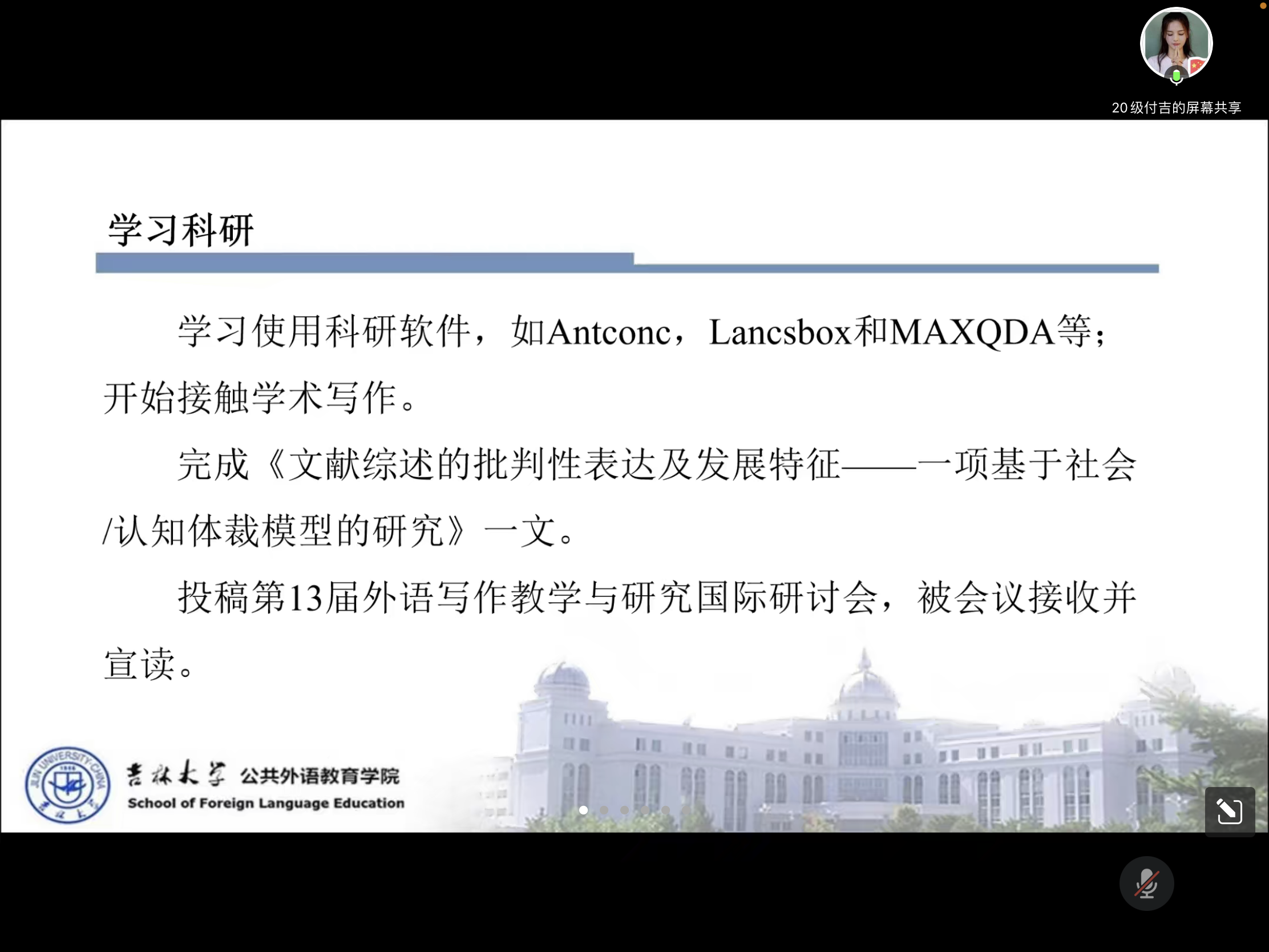 交流学习促进步,分享经验共提升。为帮助大家更好地了解国家奖学金、学习优秀研究生的精神,2022年11月16日,公共外语教育学院线上举办了研究生国家奖学金经验分享会。本次会议由公共外语教育学院研究生会学术部部长武铭伦主持,研究生辅导员曾媛出席本次分享会,特邀三名国家奖学金获奖同学分享学习经验,全体2021、2022级研究生参会。