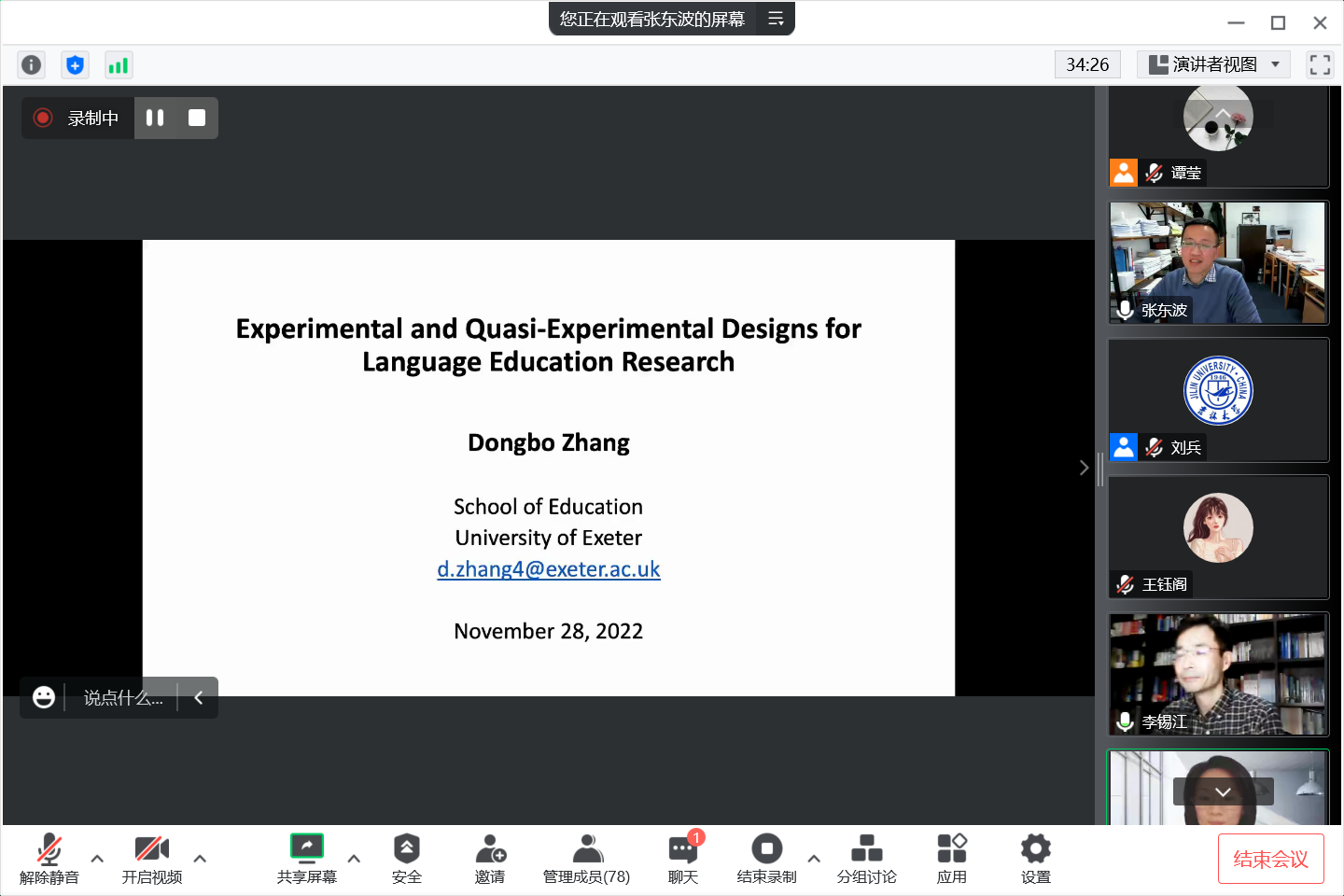 应米兰官方版网站登录入口邀请,国际知名应用语言学学者、英国埃克塞特大学Zhang Dongbo教授,于2022年11月28日在线上进行专题学术讲座。讲座由副院长张锦教授主持,校内外广大教师和学生参加了此次讲座。