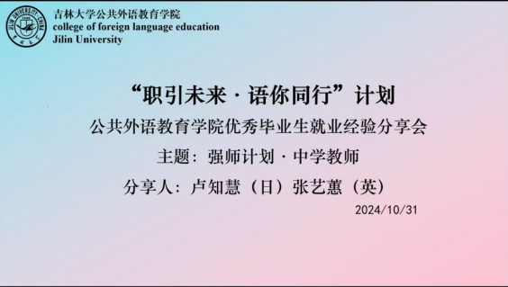 为帮助学院研究生深入了解中学教师就业现状,提升求职竞争力,为未来职业发展夯实基础,2024年10月30日晚,公共外语教育学院举办“职引未来·语你同行”——强师计划·中学教师就业经验分享会。此次分享会由学院就业兼职辅导员张明珠主持,学院2024届毕业生卢知慧、张艺蕙主讲,研究生辅导员林明帅和各年级研究生同学线上参会。